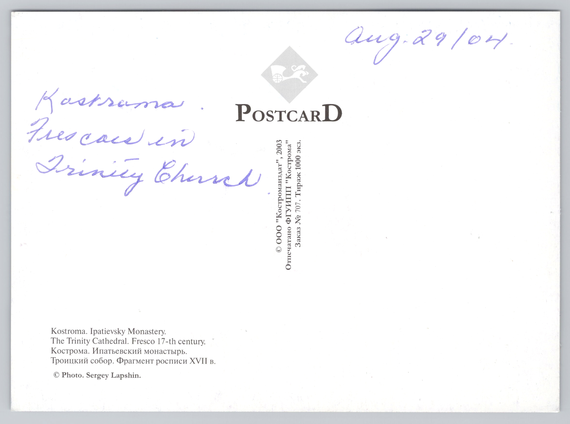 Postcard Ipatievsky Monastery Trinity Cathedral 17th Century Fresco Russia 31 January 2026 $5.00 1 in stock Postcard Ipatievsky Monastery Trinity Cathedral 17th Century Fresco Russia quantity Add to cart Buy with SKU: 132 Categories: International, Postcards, Russia Description Additional information Description Postcard Ipatievsky Monastery Trinity Cathedral 17th Century Fresco Russia Additional information Weight 0.08 kg Related products Postcard Oken’s House and Castle Warwick England $5.00 Add to cart Postcard The Mona Lisa Louvre Museum $5.00 Add to cart Postcard Sponge Market, Nassau, Bahamas $12.00 Add to cart Stratford-Upon-Avon Holy Trinity Church, Shakespeare’s Birthplace, Etc. Postcard $5.00 Add to cart