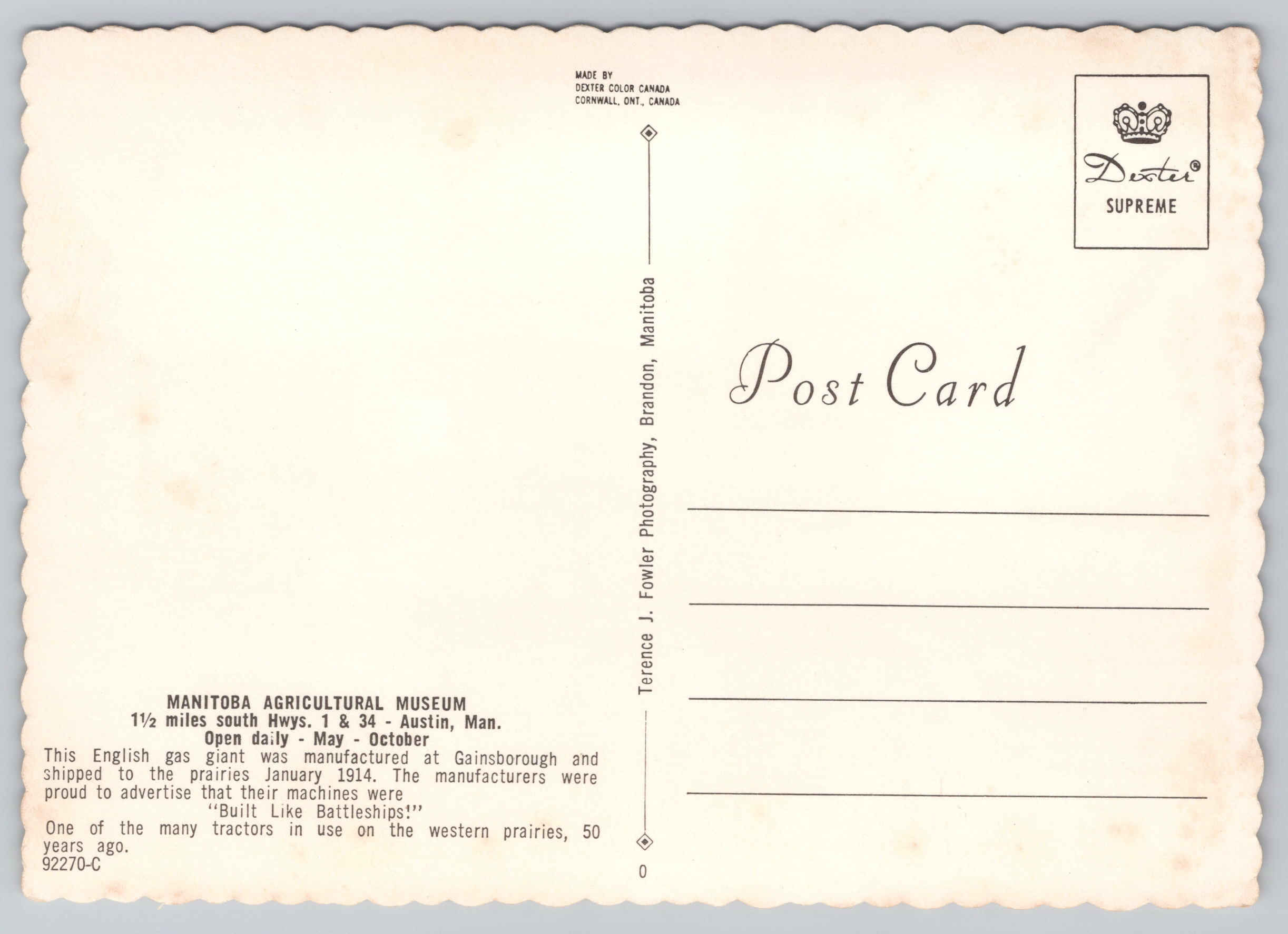 Marshall Gas Engine 1914 Manitoba Agricultural Museum Dexter Color Postcard