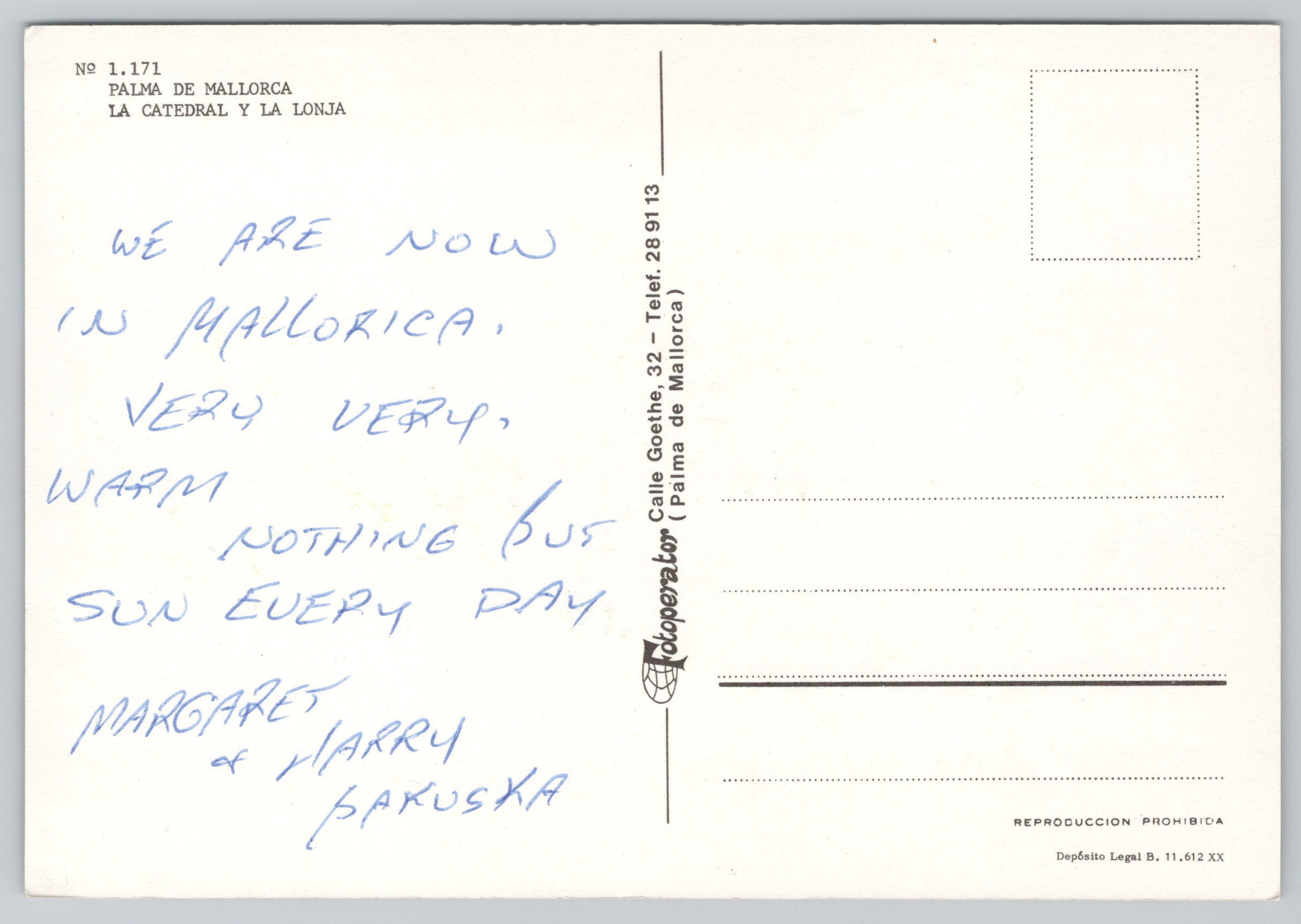 Postcard Palma de Mallorca 31 January 2026 $5.00 1 in stock Postcard Palma de Mallorca quantity Add to cart Buy with SKU: 024 Categories: International, Postcards, Spain Description Additional information Description Postcard Palma de Mallorca Additional information Weight 0.08 kg Related products Shap Wells Hotel, Cumbria Near Penrith England Postcard $5.00 Add to cart Postcard Sponge Market, Nassau, Bahamas $12.00 Add to cart Postcard Seaside Resort Callantsoog $5.00 Add to cart Postcard Warwick Castle and the River Avon from the Bridge $5.00 Add to cart