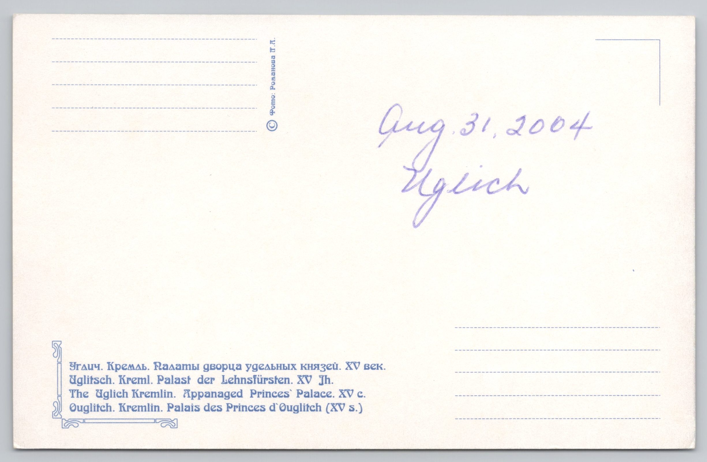 Postcard The Princely Chamber, Uglich Kremlin, Russia 31 January 2026 $5.00 1 in stock Postcard The Princely Chamber, Uglich Kremlin, Russia quantity Add to cart Buy with SKU: 084 Categories: International, Postcards, Russia Description Additional information Description Postcard The Princely Chamber, Uglich Kremlin, Russia Additional information Weight 0.08 kg Related products Postcard Oken’s House and Castle Warwick England $5.00 Add to cart Postcard Norwich Strangers’ Hall $5.00 Add to cart Postcard Ontario Canada Church Altar CYKO RPPC 1904-1920s $25.00 Add to cart Postcard Hurricane Mark 1 No. 257 Squadron $5.00 Add to cart